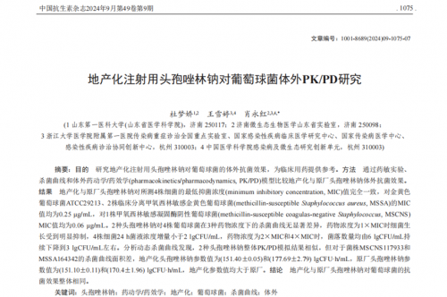 今日推荐:2024年9月在《中国抗生素杂志》上发表的一篇文章“地产化注射用头孢唑林对葡萄球菌体外PK/PD研究”。本研究通过药敏实验、杀菌曲线和体外药动学/药效学( PK/PD)模型比较地产化与原厂头孢唑林钠体外抗菌效果。