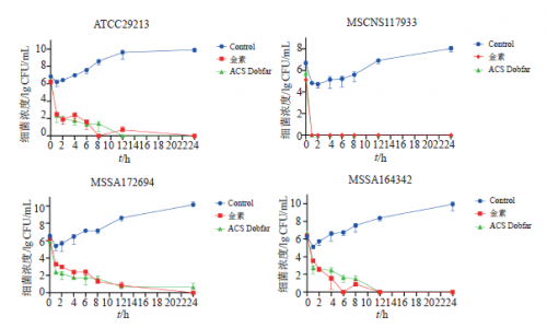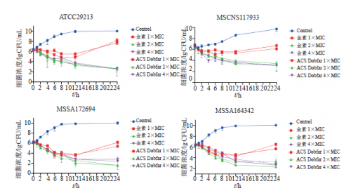 地产化与原厂头孢唑林钠对所测4株细菌的最低抑菌浓度(MIC)值完全一致,对金黄色葡萄球菌ATCC29213、2株临床分离甲氧西林敏感金黄色葡萄球菌(MSSA)的MIC 值均为0.25 μg/mL,对1株甲氧西林敏感凝固酶阴性葡萄球菌(MSCNS) MIC值均为0.06 μg/mL。2种头孢唑林钠对4株葡萄球菌在3种药物浓度下的杀菌曲线无显著差异,药物浓度为1×MIC时细菌生 长受到明显抑制,4株细菌24 h菌液浓度增量小于2 lgCFU/mL,药物浓度为2×MIC和4×MIC时,菌落数量均由6lgCFU/mL持续下降到3 lgCFU/mL左右。(图1)